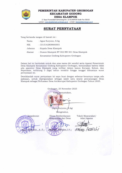 Selasa, 25 November 2025, Pemerintah Desa Klampok melaksanakan Sosialisasi sekaligus Penandatanganan Pakta Integritas sebagai langkah nyata menuju Desa Anti Korupsi.